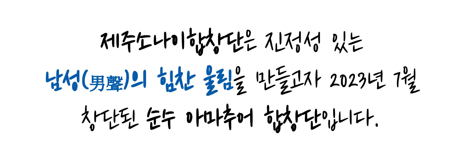 제주도 내 초교파 기독 남성들로 구성된 제주소나이합창단은 다양한 성가곡과 합창곡을 완성도 높은 남성합창음악으로 연주하여 선교 역할과 지역사회 문화발전에 기여하고자 합니다. 또한, 제주어(濟州語) 개사 연주활동을 통해 제주 고유 언어에 대한 관심과 보전에 적극 나서고 있습니다. 각종 국내외 무대 연주, 교회순회연주 등을 통해 제주남성합창과 제주어의 우수함을 널리 알리는 활동을 펼치는 제주소나이합창단은 도내 건강한 교회에 소속된 19세 이상의 기독 소나이 누구나 함께 할 수 있습니다.